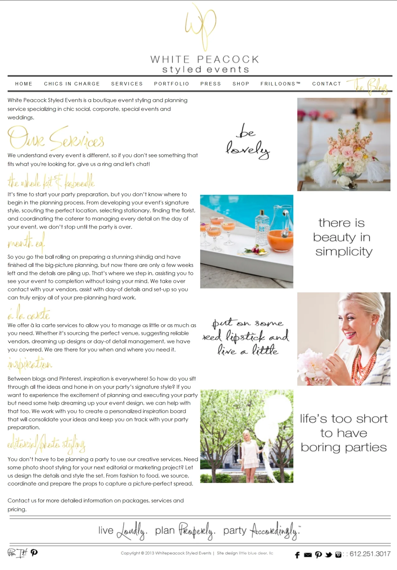 White Peacock Styled Events is a Minneapolis-based event planning and styling company, and I worked with founders Jenn and Nicole not only on brand development through writing website copy for version one of their website and through running their blog (August 2013-July 2015), but also through social media planning and outreach, email campaigns, press releases and copy for outside blog features on sites including Style Me Pretty and Wedded Mag.